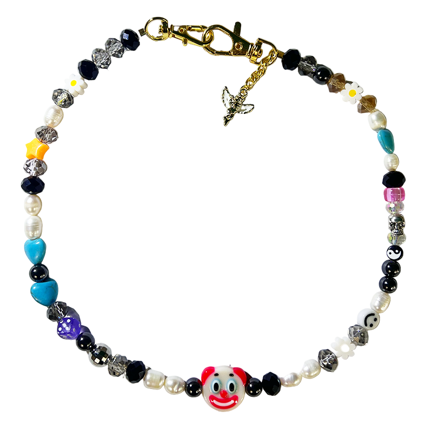 Charm materials contain fresh water pearls (yes, they are real) glass, acrylic, clay, not so precious metals and plastic charms.