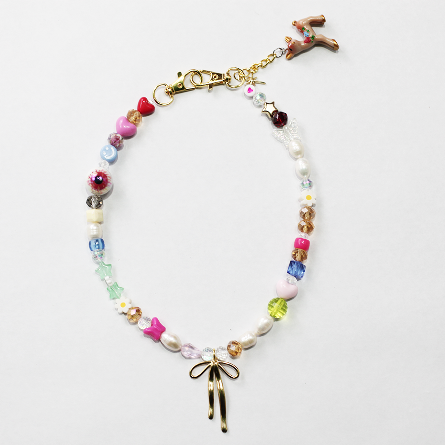 Charm materials contain fresh water pearls (yes, they are real) glass, acrylic, clay, not so precious metals and plastic charms.
