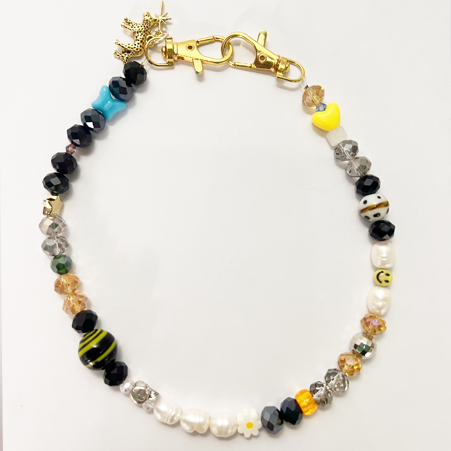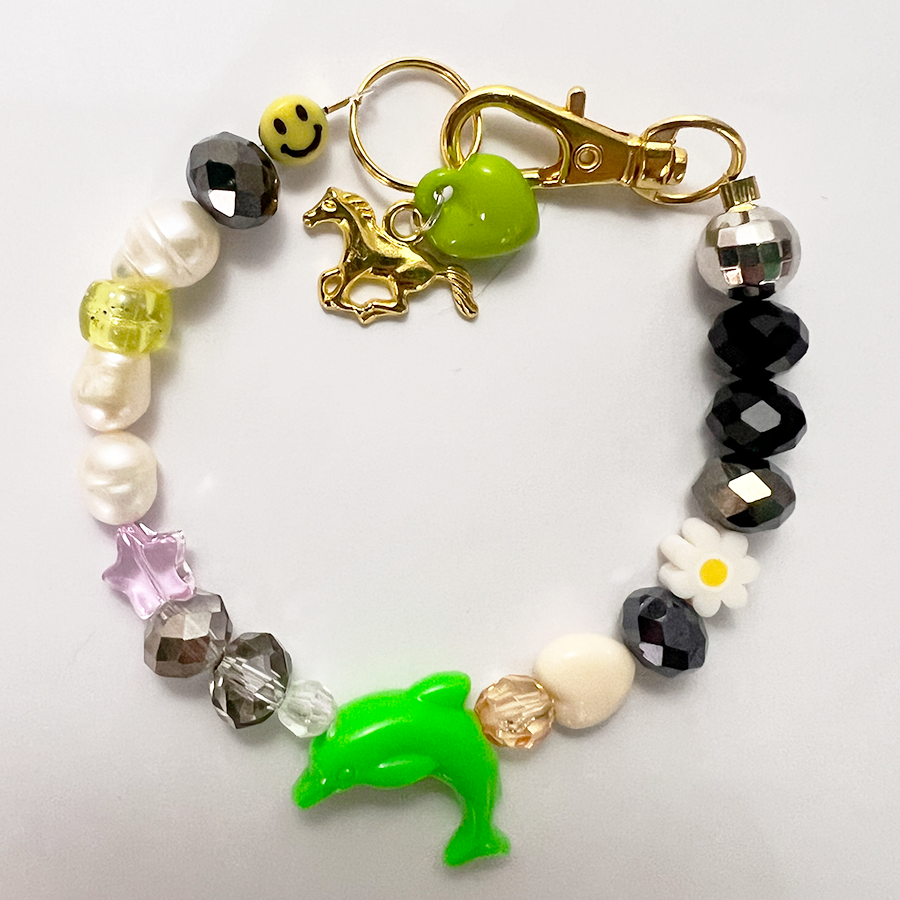 Charm materials contain fresh water pearls (yes, they are real) glass, acrylic, clay, not so precious metals and plastic charms.