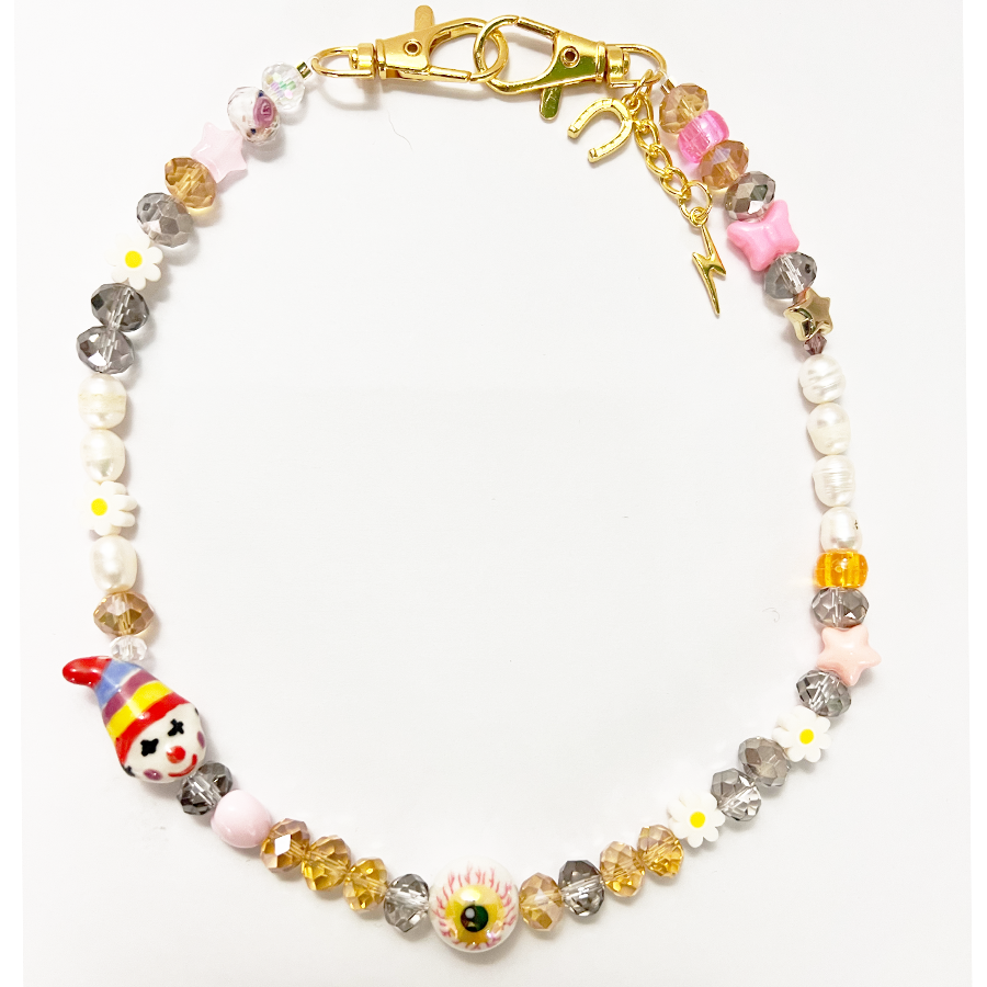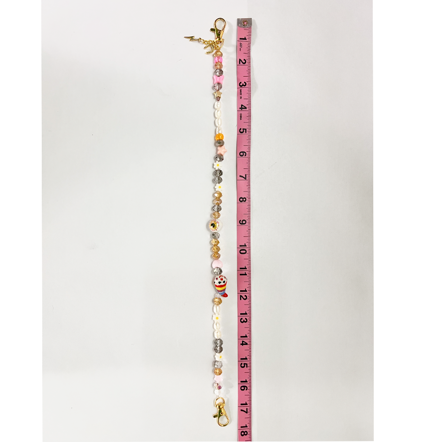 Charm materials contain fresh water pearls (yes, they are real) glass, acrylic, clay, not so precious metals and plastic charms.