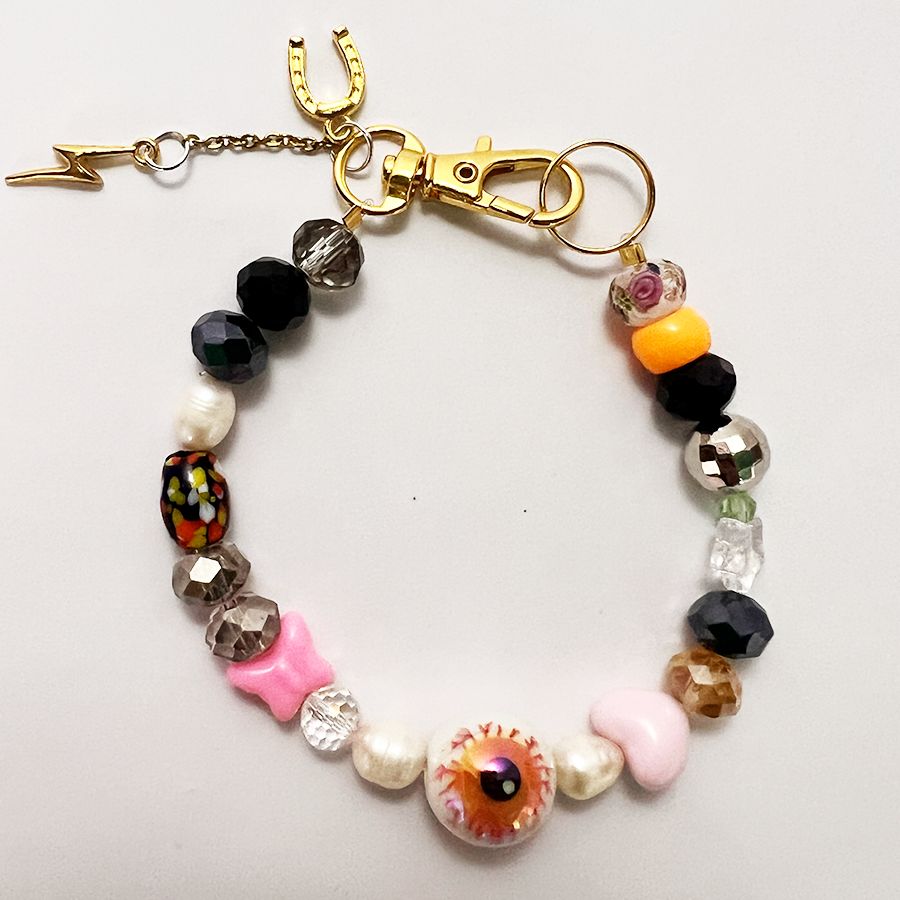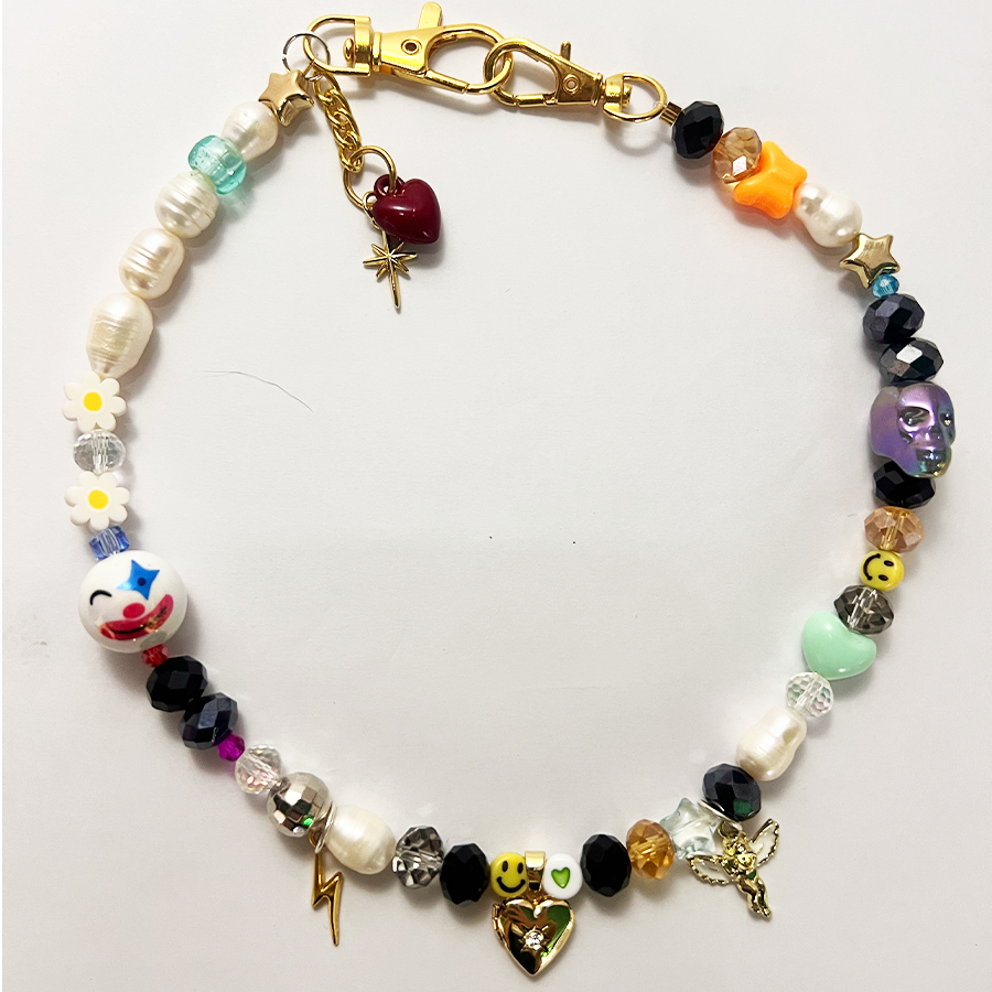 Charm materials contain fresh water pearls (yes, they are real) glass, acrylic, clay, not so precious metals and plastic charms.