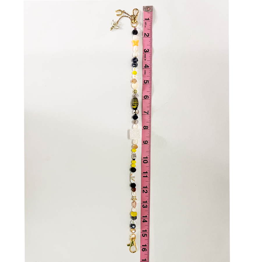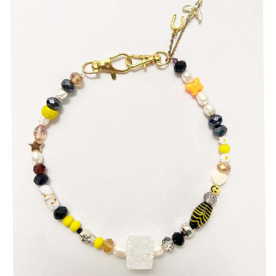 Charm materials contain fresh water pearls (yes, they are real) glass, acrylic, clay, not so precious metals and plastic charms.